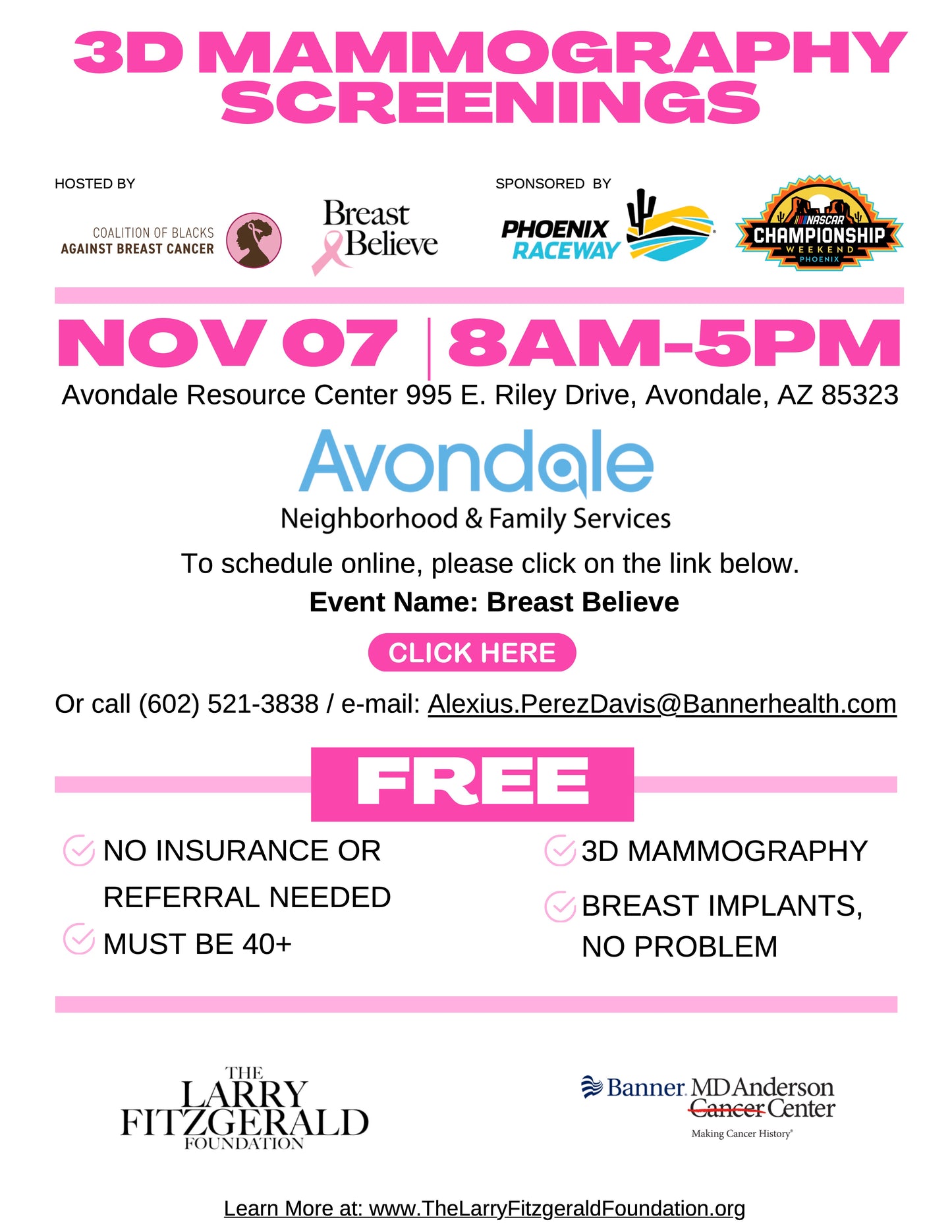 The Larry Fitzgerald Foundation is providing FREE 3D Mammograms at two (2) separate locations on November 7th in partnership with the Nascar Phoenix Raceway as part of our year round Breast Believe campaign. If you're attending the Nascar Championship and will be on-site at the track on November 7th you're welcome to sign up for location #1 hosted by Breast Believe founding partner Impact One. If you're not attending Championship, you can sign up for an appointment at location #2 on-site at the Avondale Resource Center with Breast Believe founding partner the Coalition of Blacks Against Breast Cancer and our partnership with The Big Pink Bus! These events will be hosted by Impact One and the Coalition of Blacks Against Breast Cancer and will include two (2) mammogram buses, resources and information from our Breast Believe founding partners.