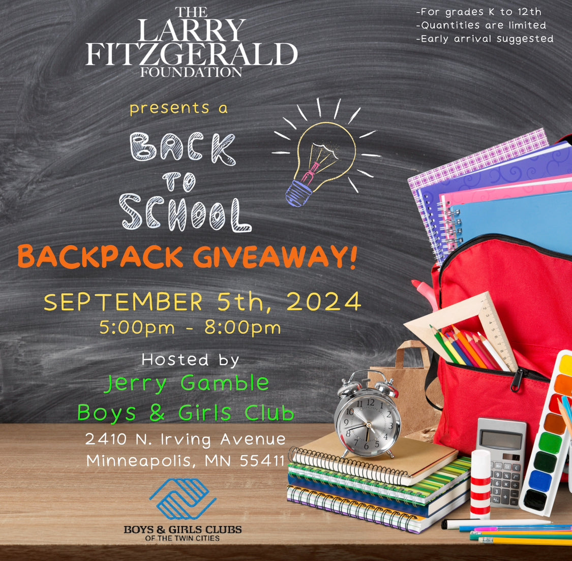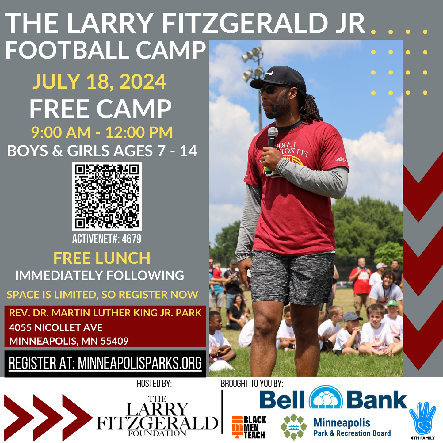 The Larry Fitzgerald Foundation is excited to invite youth to join former NFL player Larry Fitzgerald Jr. & team, for a fun and exciting day of lessons and non-contact football. This FREE 1-day camp will provide instruction, teach skills, STEM in sports, safety and the fundamentals of football for youth ages 7-14. We will also have a Back to School Backpack Giveaway provided by our community partner, Bell Bank and the Street Eats Hot Food Truck will be on-site to provide FREE lunch immediately following the camp. Space is limited so register now!