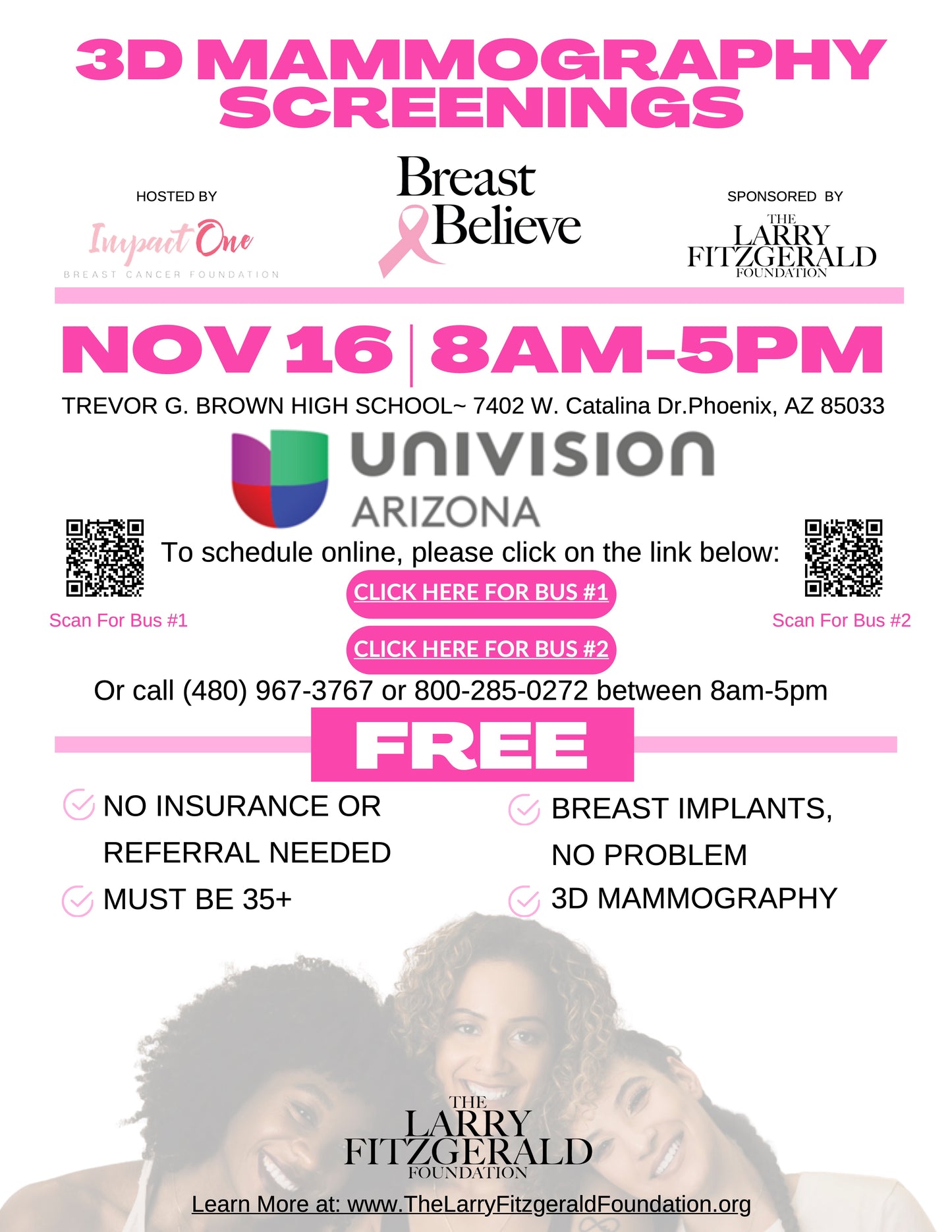 The Larry Fitzgerald Foundation is excited to provide FREE 3D Mammograms to continue our breast cancer awareness and breast health efforts as part of our year round Breast Believe campaign. This event will be hosted by Impact One, and will include resources and information from all of our Breast Believe founding partners.