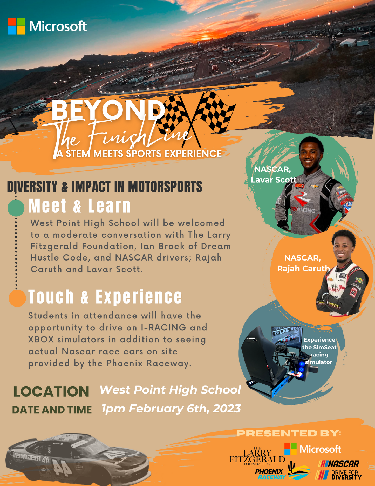 The event will take place at West Point High School with the presentation of Xbox consoles, an Xbox motorsports curriculum and a physical motorsport race car simulator all provided by Microsoft. Pace cars will be on-site from the Phoenix Raceway and there will be a panel of Q&A. Larry Fitzgerald & Danielle Frost from TLFF will be on-site along with Latasha Causey, President of the Phoenix Raceway, Ian Brock of Dream Hustle Code, young Nascar driver's Rajah Caruth and Lavar Scott along with the Microsoft team. TLFF will continue this activation and initiative throughout the year with our non-profit partners to allow youth from the community an opportunity to experience STEM through motorsports & technology. If you are a non-profit that is interested in the experience, please Click Here contact us.