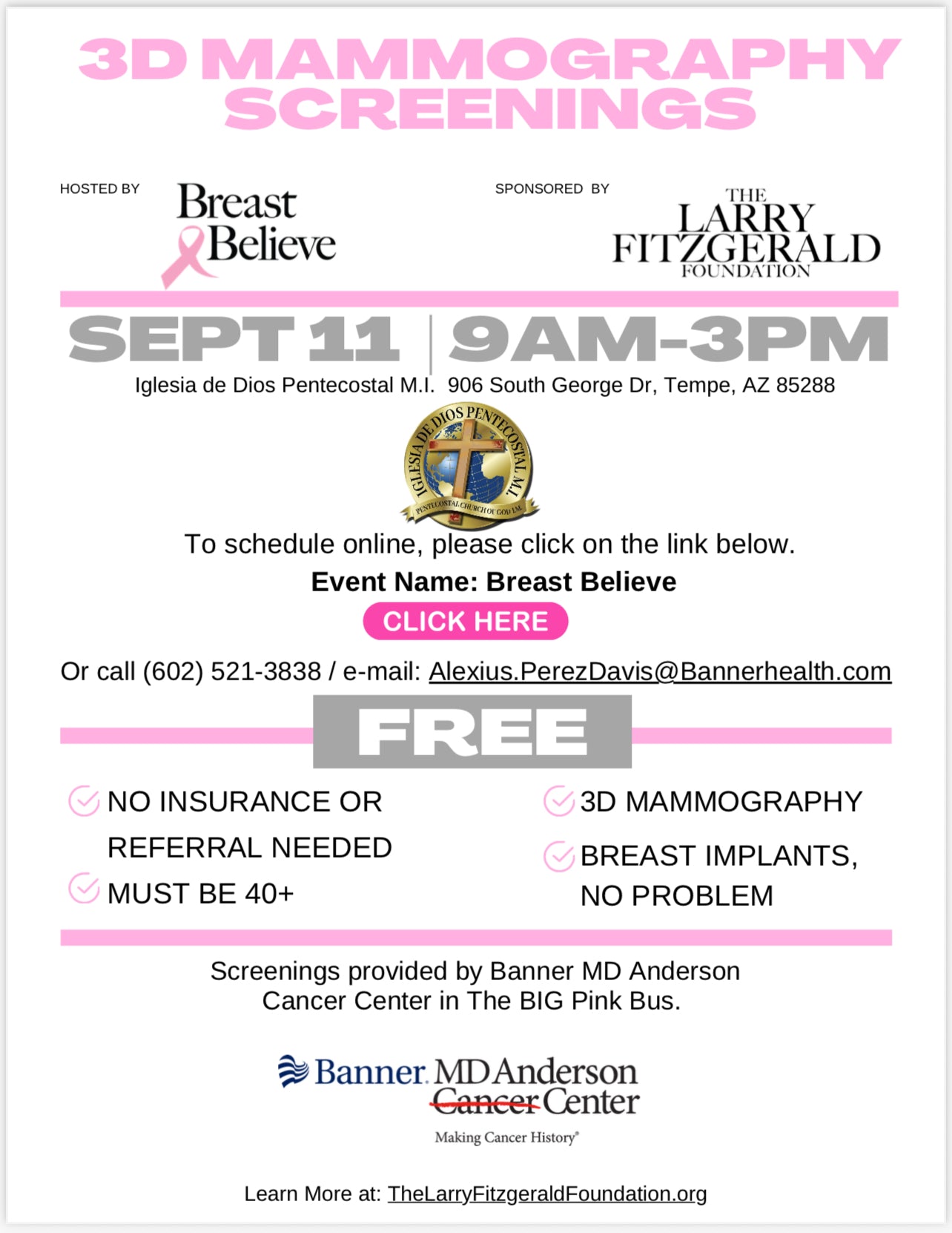 The Larry Fitzgerald Foundation is excited to provide FREE 3D Mammograms at Iglesia de Dios Pentecostal MI in partnership with Banner MD Anderson's Big Pink Bus.