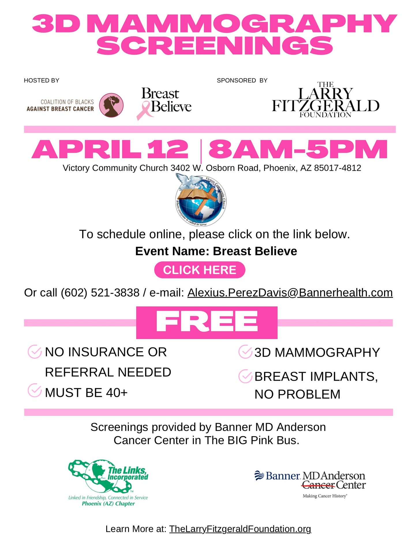 The Larry Fitzgerald Foundation is excited to provide FREE 3D Mammograms to continue our breast cancer awareness and breast health efforts as part of our year round Breast Believe campaign. This event will be hosted by one of our Breast Believe founding partners, the Coalition of Blacks Against Breast Cancer and The LINKS Inc. (AZ Chapter), and will include resources and information. Screenings will take place on Banner MD Anderson's Big Pink Bus.