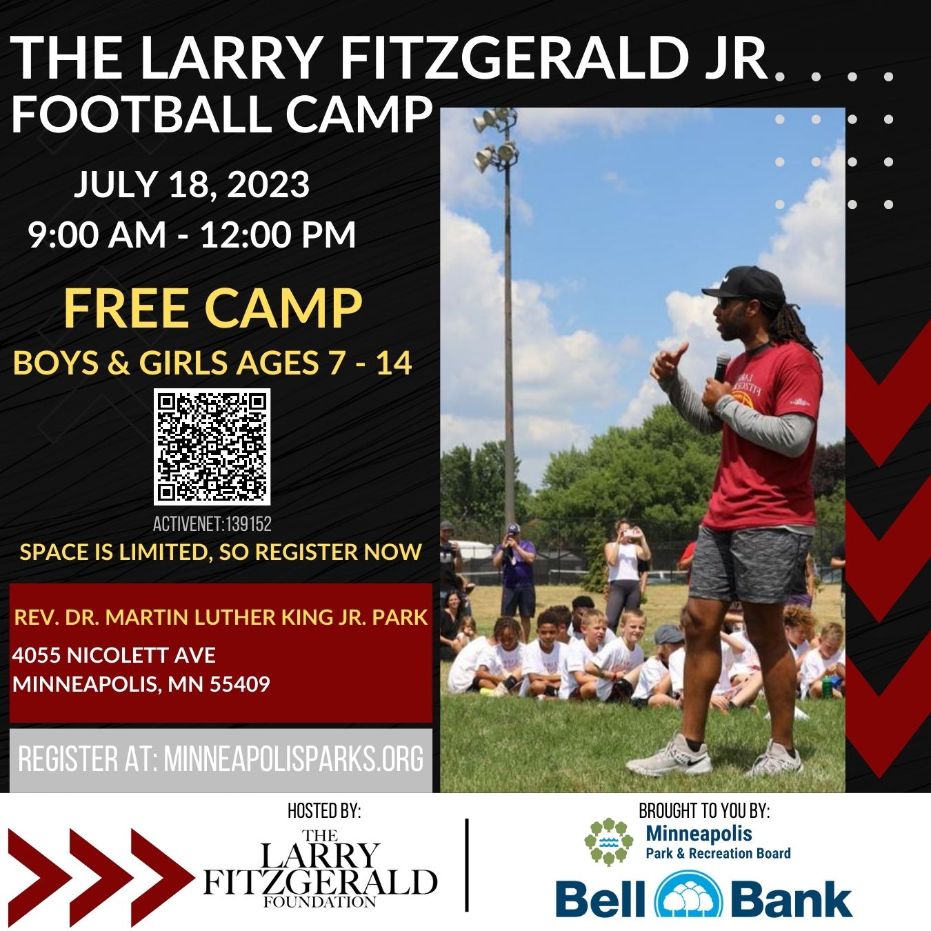 The Larry Fitzgerald Foundation is excited to invite youth to join former NFL player Larry Fitzgerald Jr. & team, for a fun and exciting day of lessons and non-contact football. This FREE 1-day camp will provide instruction, teach skills, safety and the fundamentals of football for youth ages 7-14. Lunch will be included and this year's camp will be followed by music, fun and games with Pop-Up Parks provided by Minneapolis Parks and Recreation. Space is limited so register now!