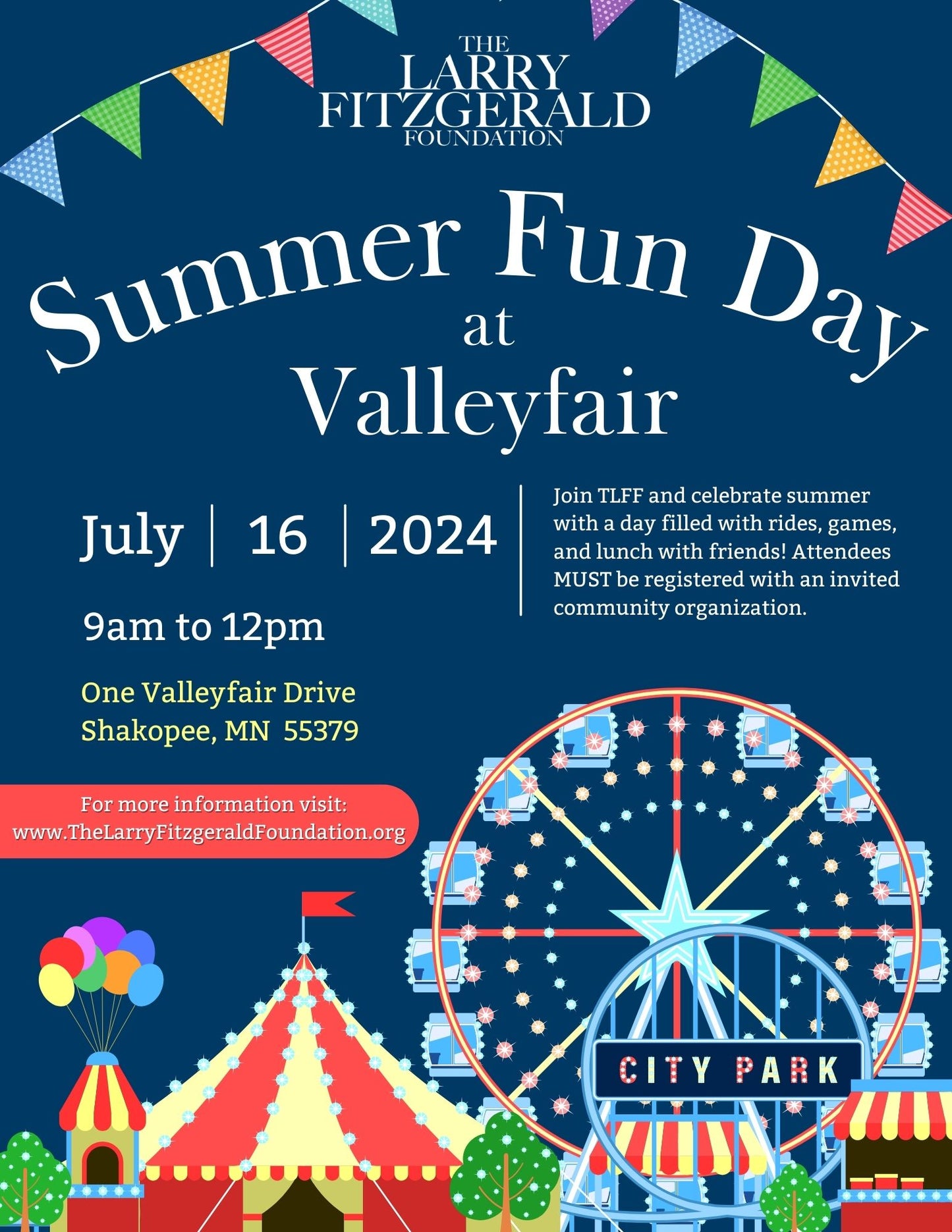 The Larry Fitzgerald Foundation is excited to host another amazing group of youth and community organizations for our annual SUMMER FUN DAY! Youth will have the opportunity to experience Valleyfair and enjoy a day full of rides, games and time with friends. We are honored to recognize the great work of our community partners and the special experiences that create wonderful memories for the youth of our communities. Attendees must be registered with an invited community organization to participate.